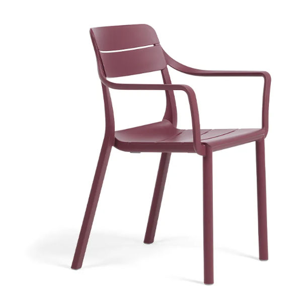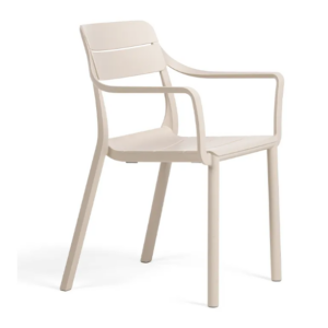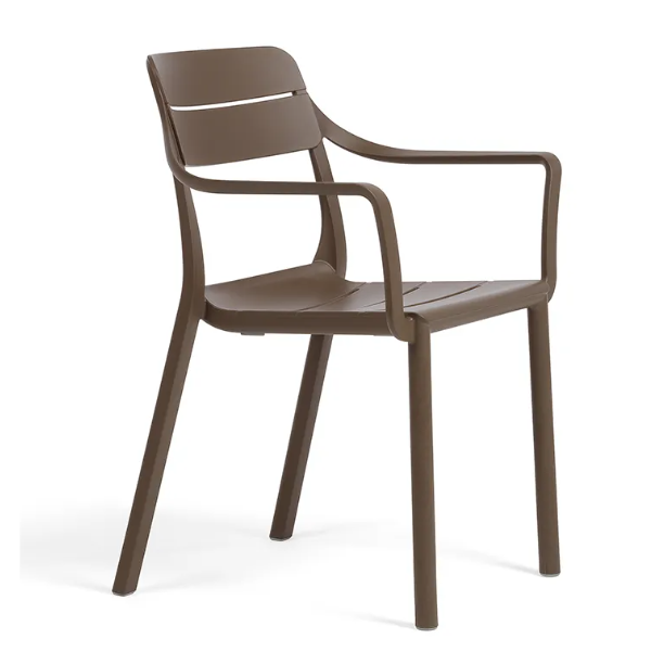 Doghe orizzontali stilizzate, massimo comfort e versatilità per la seduta con braccioli Cassia, progettata con misure contenute per massimizzare e valorizzare i piccoli spazi.