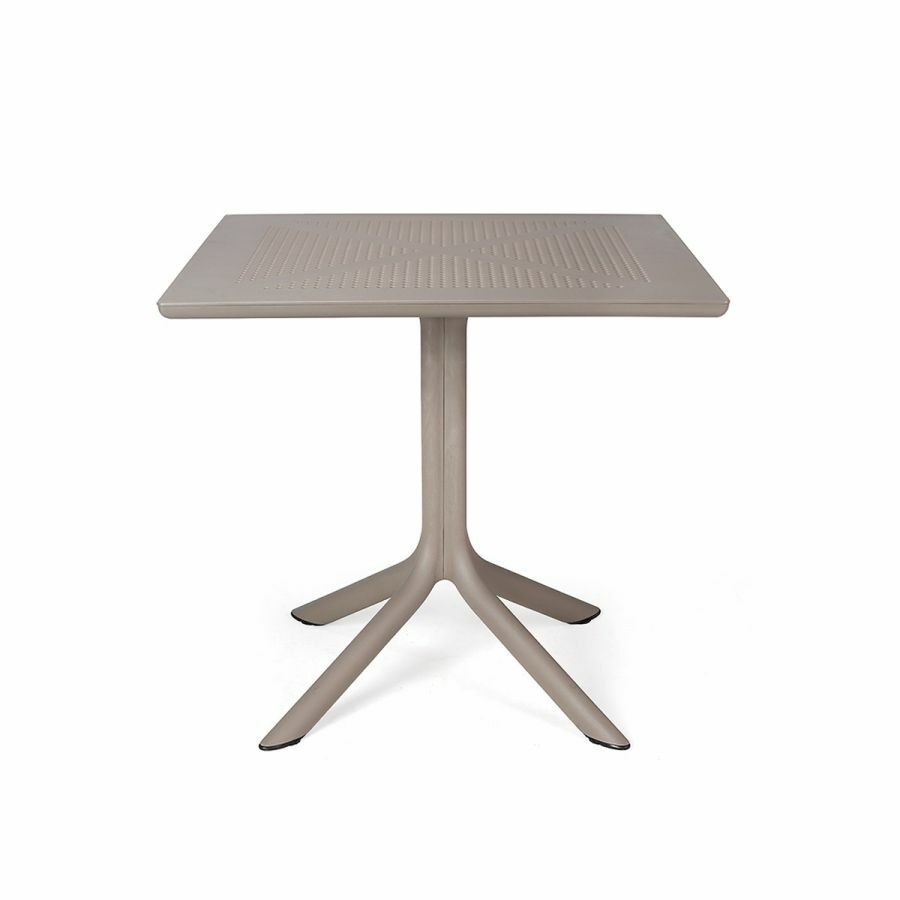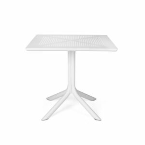 Appositamente studiato per occupare poco spazio, Clip è un tavolo professionale quadrato in resina fiberglass con gamba centrale a quattro razze e piano in DurelTop foto-inciso con un motivo bucherellato rotondo.