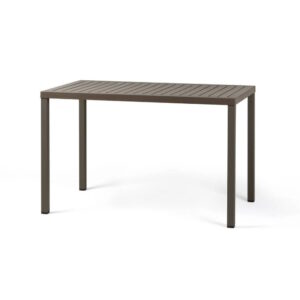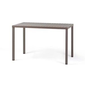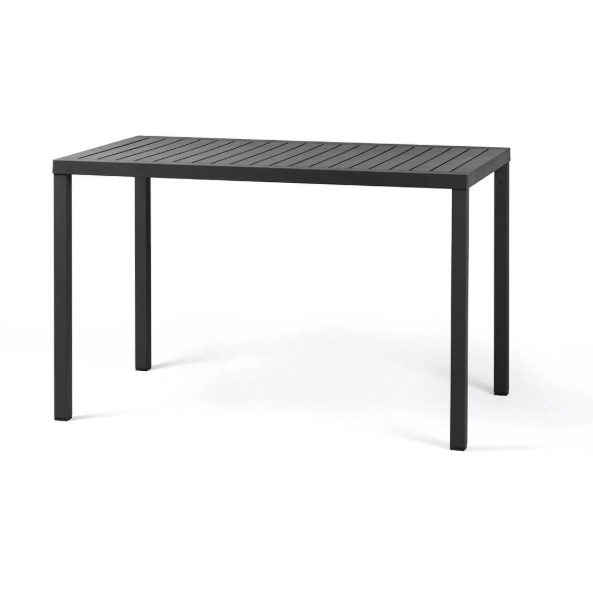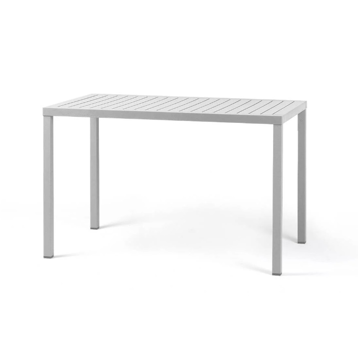 Tavolo impilabile 120×70 cm. Materiale: piano DurelTOP in polipropilene trattato anti-UV, colorato in massa. Gambe in alluminio verniciato. Finitura opaca. Dotato di piedini regolabili. Resina riciclabile.