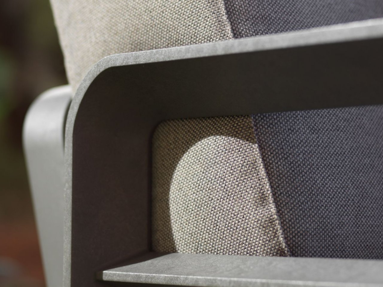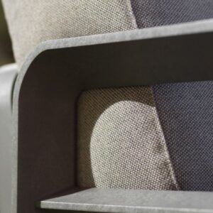 RIVESTIMENTO Tessuto Acrilico Sunbrella®: 50% fibra acrilica Sunbrella® riciclata tinto in massa, 47% fibra acrilica Sunbrella® tinto in massa, 3% poliestere. Solidità alla luce 8/8, lavabile a 30°, trattamento Non PFAS idrorepellente, antimacchia. IMBOTTITURA Cuscino Seduta: poliuretano espanso (densità 25 kg/m3) rivestito da ovatta in fibra di poliestere accoppiata a tessuto 100% poliestere con trattamento Water Repellent (WR) (densità 400 gr/m2) e parte sottostante in rete di filato poliestere ( 90 gr/m2). Cuscino Schienale: poliuretano espanso (densità 17 kg/m3) rivestito da ovatta in fibra di poliestere accoppiata a tessuto 100% poliestere con trattamento Water Repellent (WR) (densità 200 gr/m2)