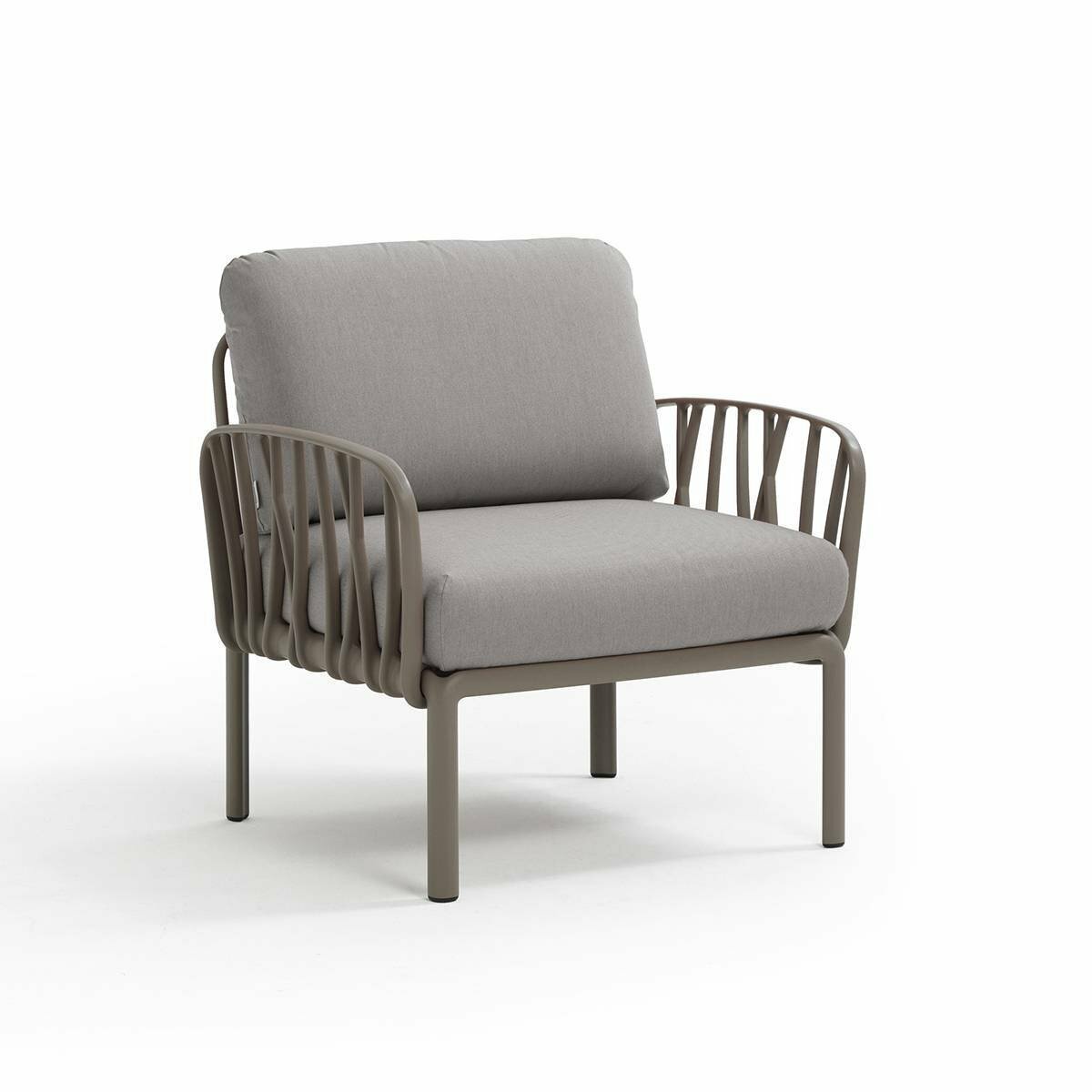 Rilassante poltrona con braccioli in resina fiberglass e imbottiti. Acquistabile singolarmente o progettabile come elemento compositivo in set più ampi previsti dalla collezione di sedute modulari Komodo.