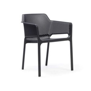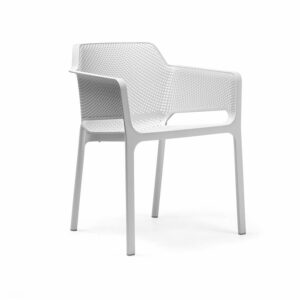 Raffinato relax per Net, monoscocca in resina fiberglass accuratamente bucherellata con un motivo a fori quadrati e raggiati distribuiti in continuità sulla superficie tridimensionale della seduta.