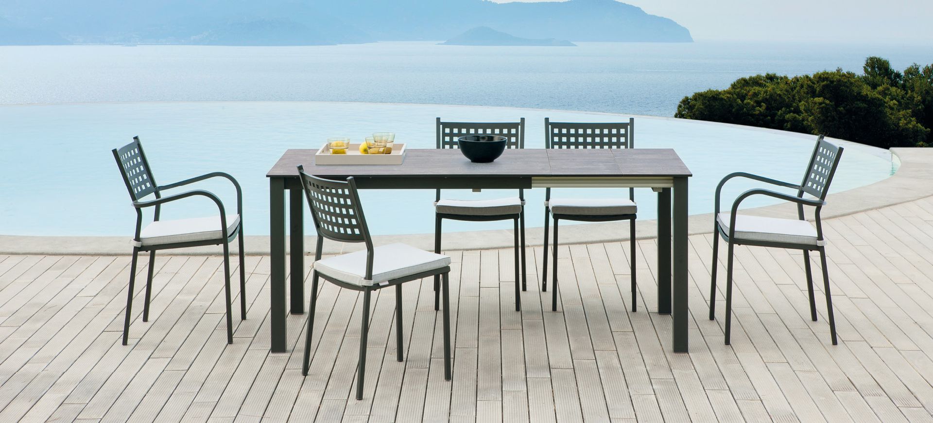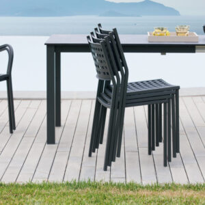 Completa di tutto, sedie, tavolo, poltrone e divani, si adatta a qualsiasi ambiente grazie a un design sobrio e contemporaneo. Tra le novità della serie il tavolo allungabile con piano in HPL, resistente, pratico e funzionale.