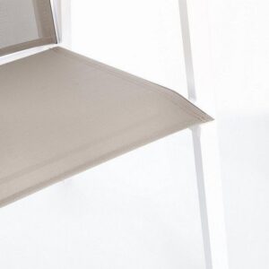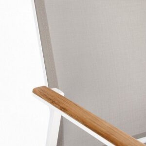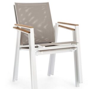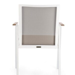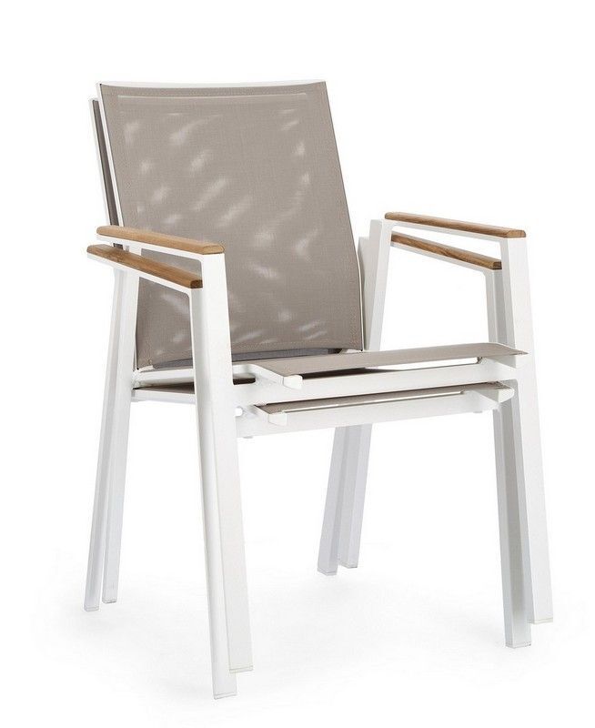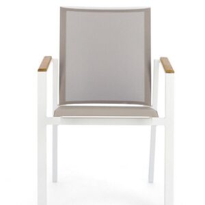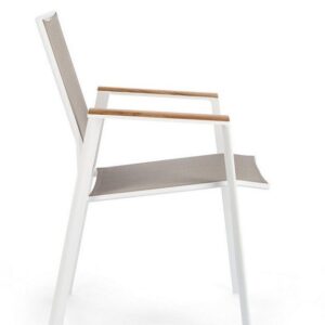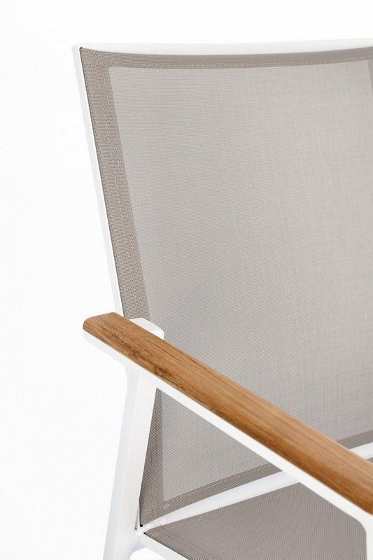 STRUTTURA IN ALLUMINIO, VERNICIATO A POLVERE (POLIESTERE). BRACCIOLI CON INSERTI IN TEAK. SEDUTA E SCHIENALE RIVESTITI IN TEXTILENE PHIFER 1X1. IMPILABILE.
