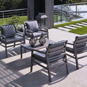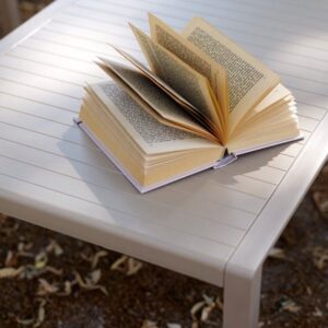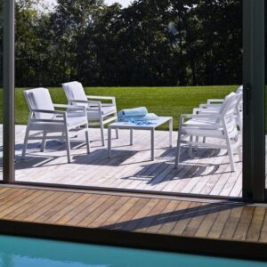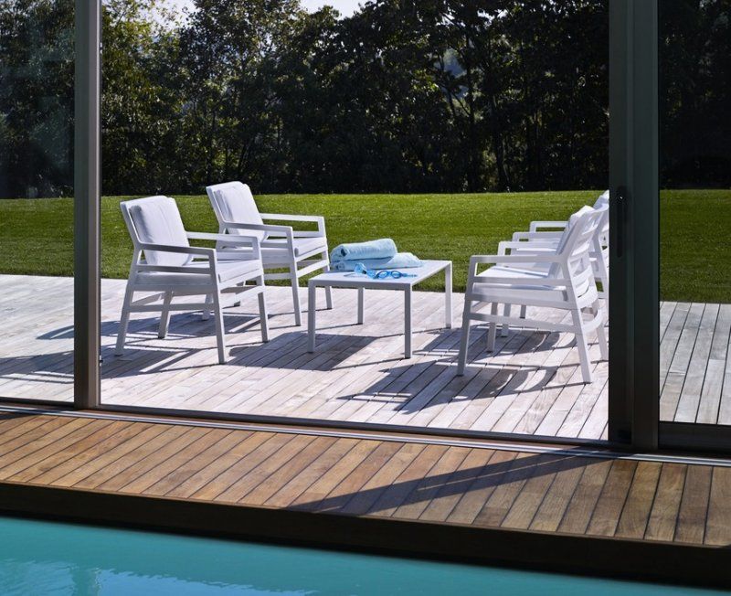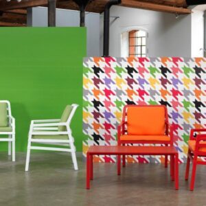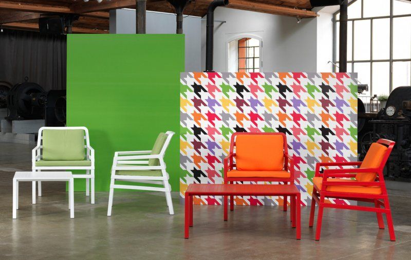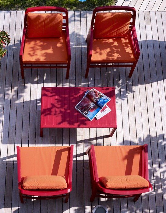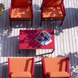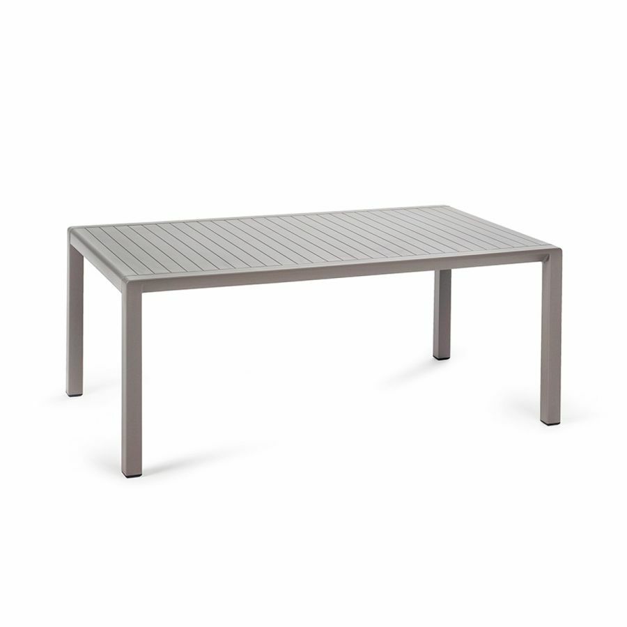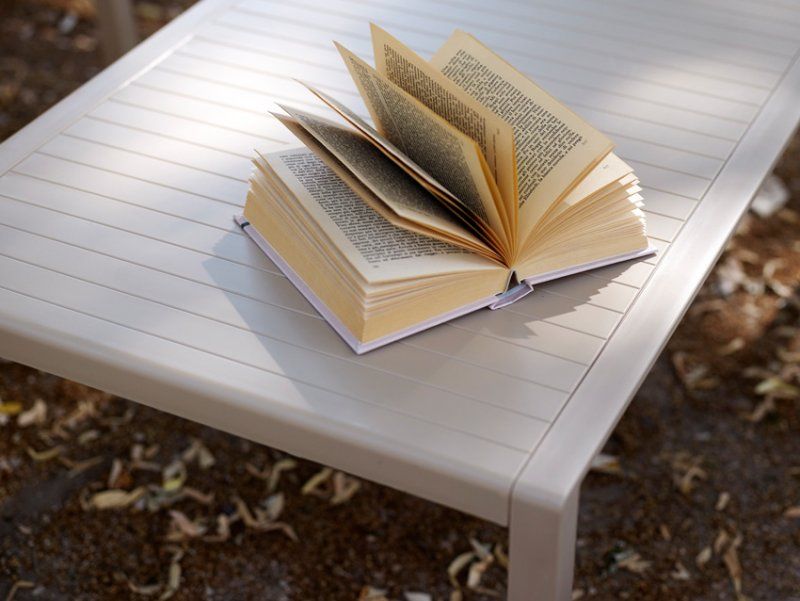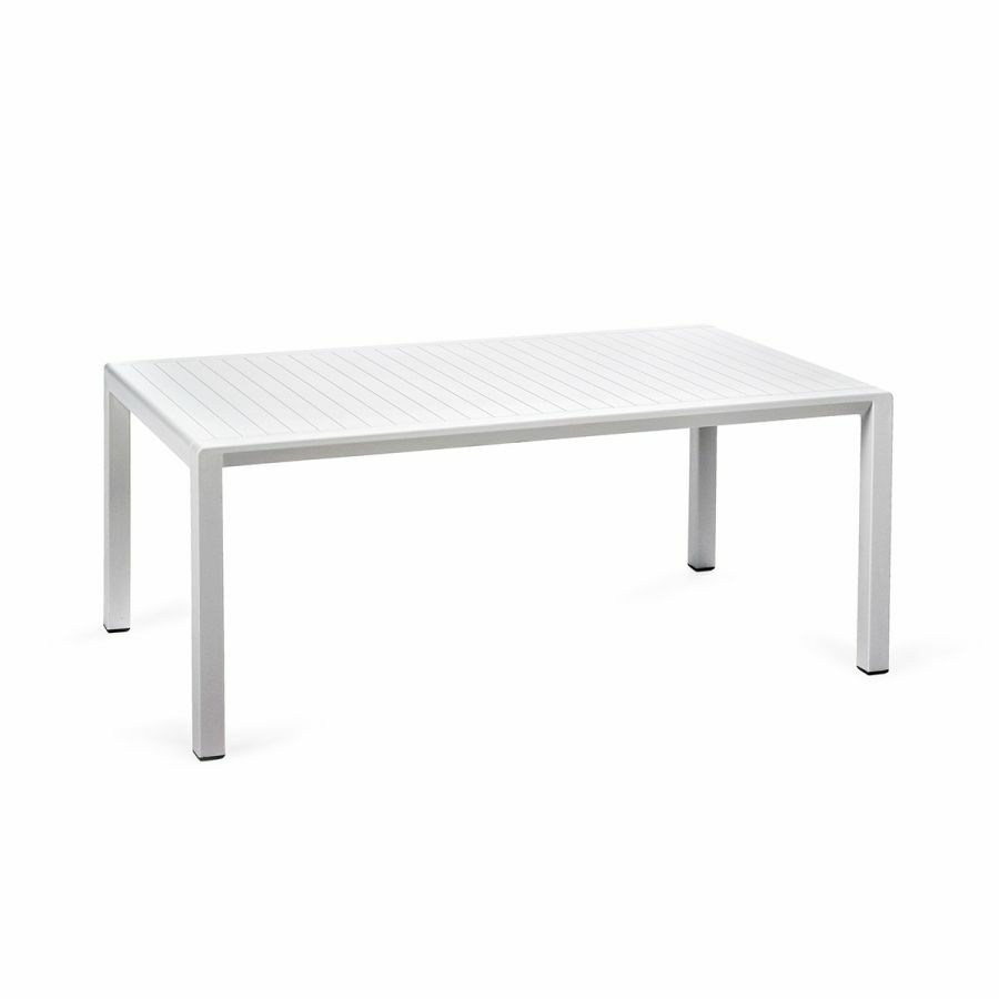 Tavolo basso. Polipropilene trattato anti-UV e colorato in massa. Finitura opaca. Dotato di piedini antiscivolo. Resina riciclabile.
