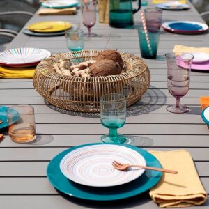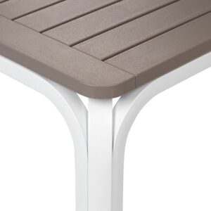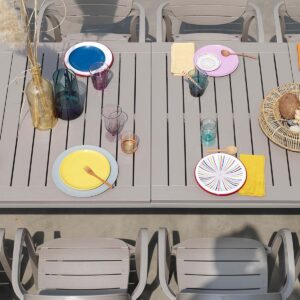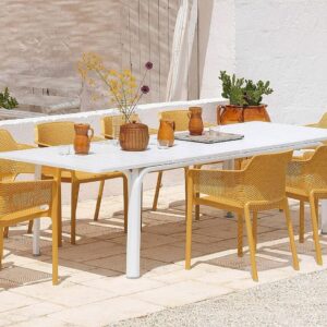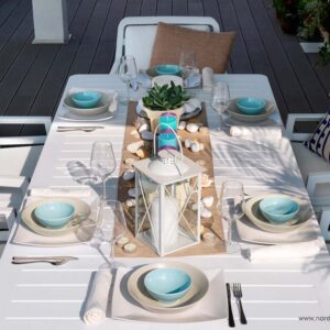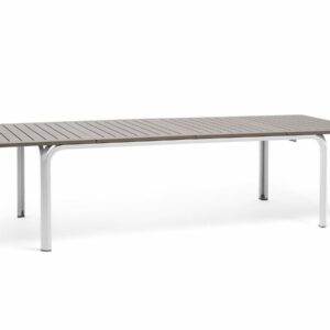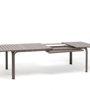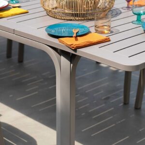 Tavolo allungabile. Piano DurelTOP in polipropilene trattato anti-UV, colorato in massa. Gambe in alluminio verniciato. Finitura opaca. Dotato di piedini regolabili. 210-280 x 100 x 73h cm. Resina riciclabile.