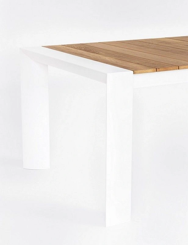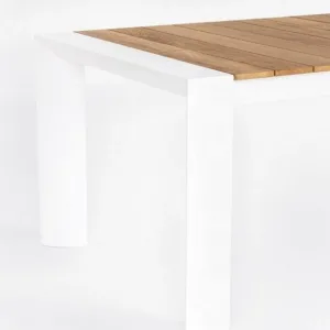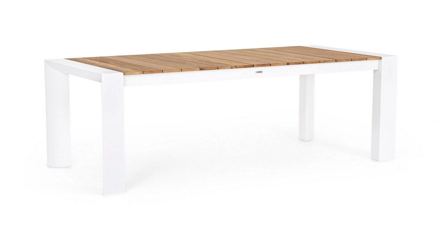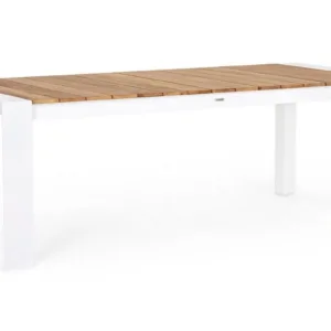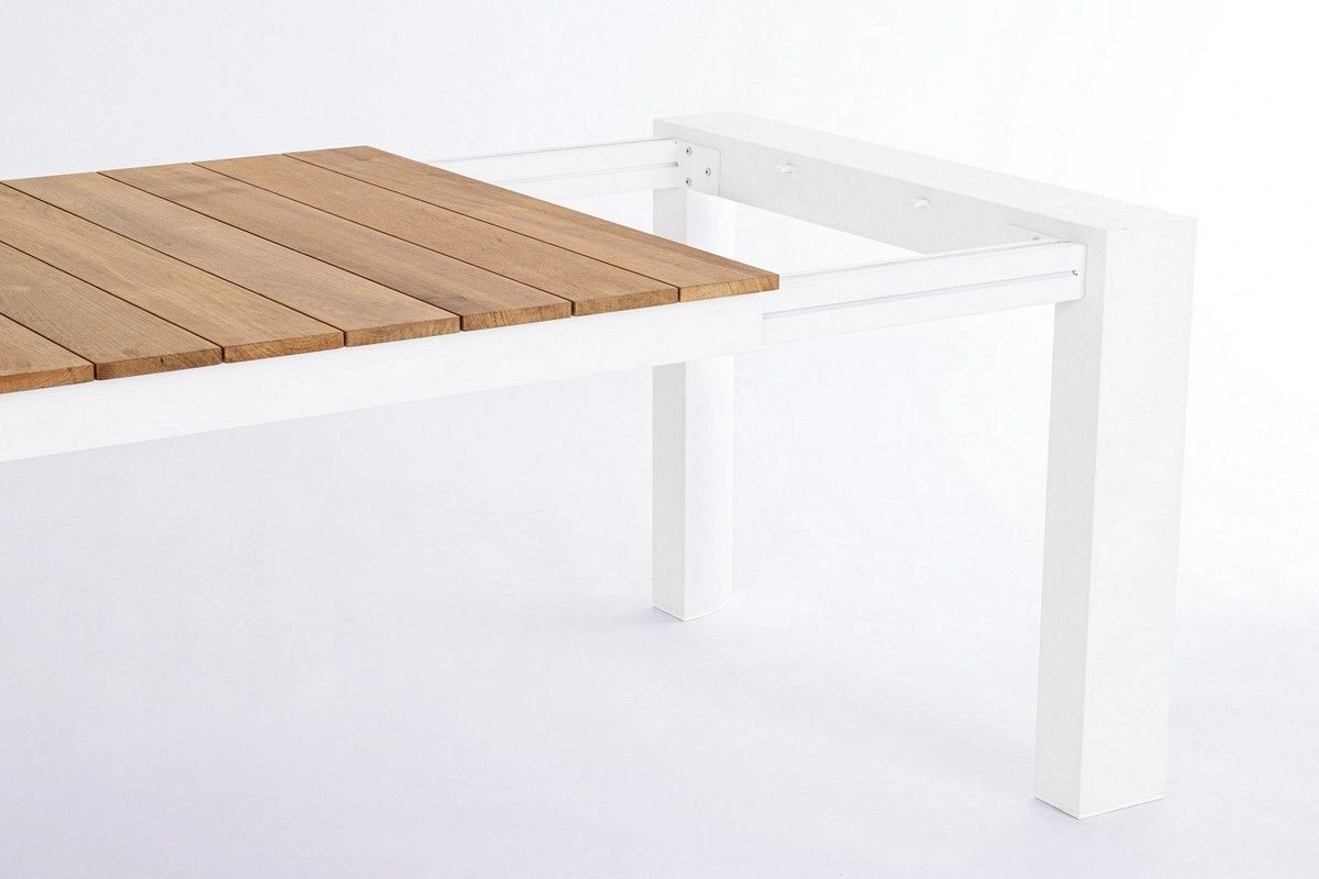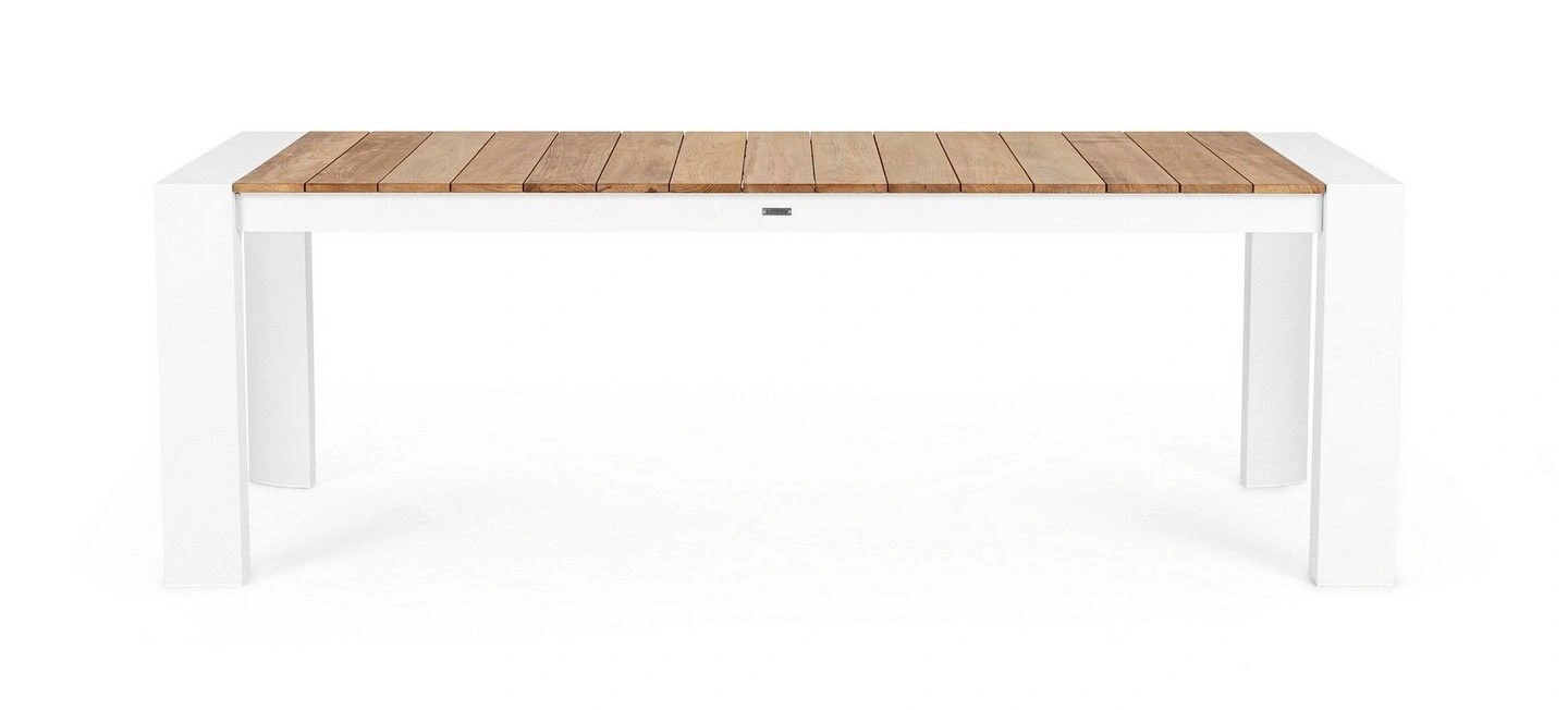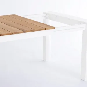 STRUTTURA IN ALLUMINIO, VERNICIATO A POLVERE (POLIESTERE). PIANO IN TEAK. ALLUNGABILE CON APERTURA TELESCOPICA. PROLUNGHE ESTERNE CON ALLOGGIO SOTTO IL PIANO. VITERIA IN ACCIAIO INOSSIDABILE. PIEDINI IN PLASTICA REGOLABILI. GAMBE DA ASSEMBLARE.