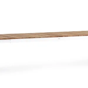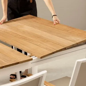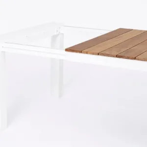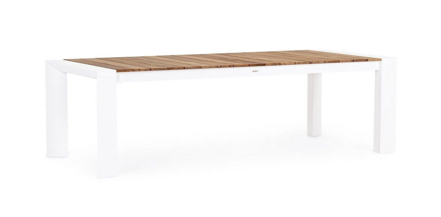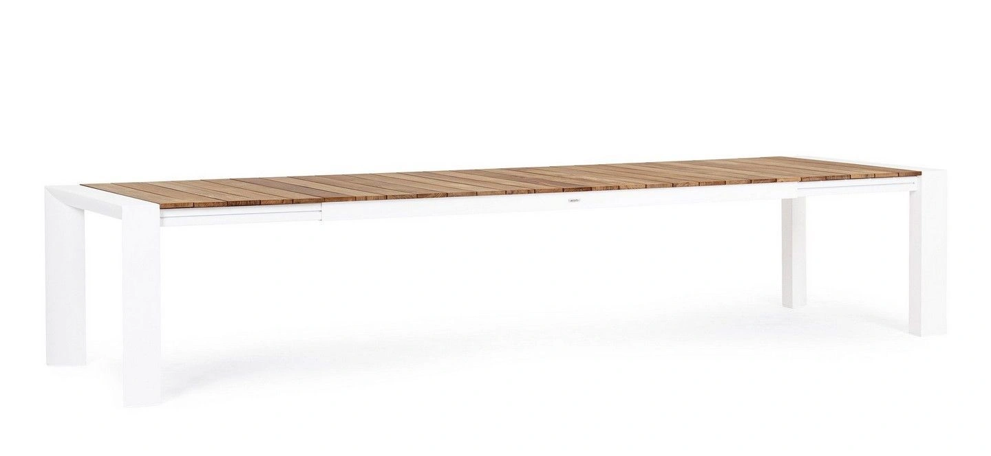 STRUTTURA IN ALLUMINIO, VERNICIATO A POLVERE (POLIESTERE). PIANO IN TEAK. ALLUNGABILE CON APERTURA TELESCOPICA. PROLUNGHE ESTERNE CON ALLOGGIO SOTTO IL PIANO. VITERIA IN ACCIAIO INOSSIDABILE. PIEDINI IN PLASTICA REGOLABILI. GAMBE DA ASSEMBLARE.